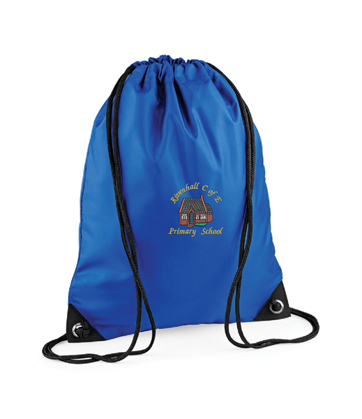 Royal Blue Drawstring PE Bag with Rivenhall Primary School logo to front of bag.